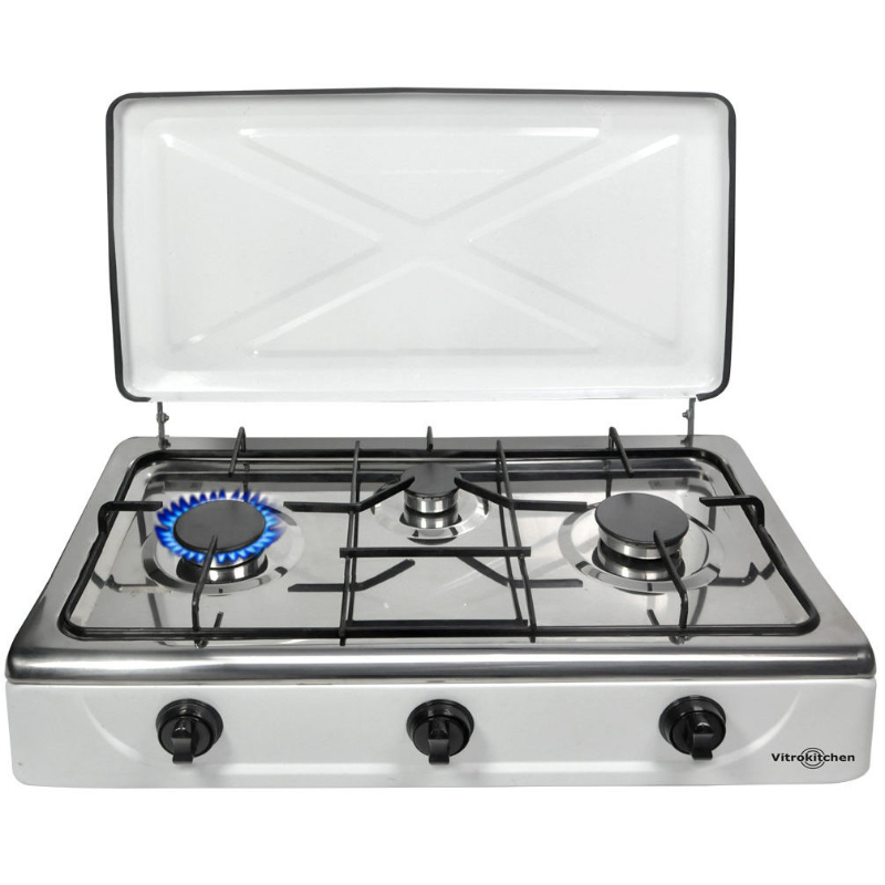 3 Quemadores desmontables de aluminio pulido. Parrilla de acero esmalta en negro.