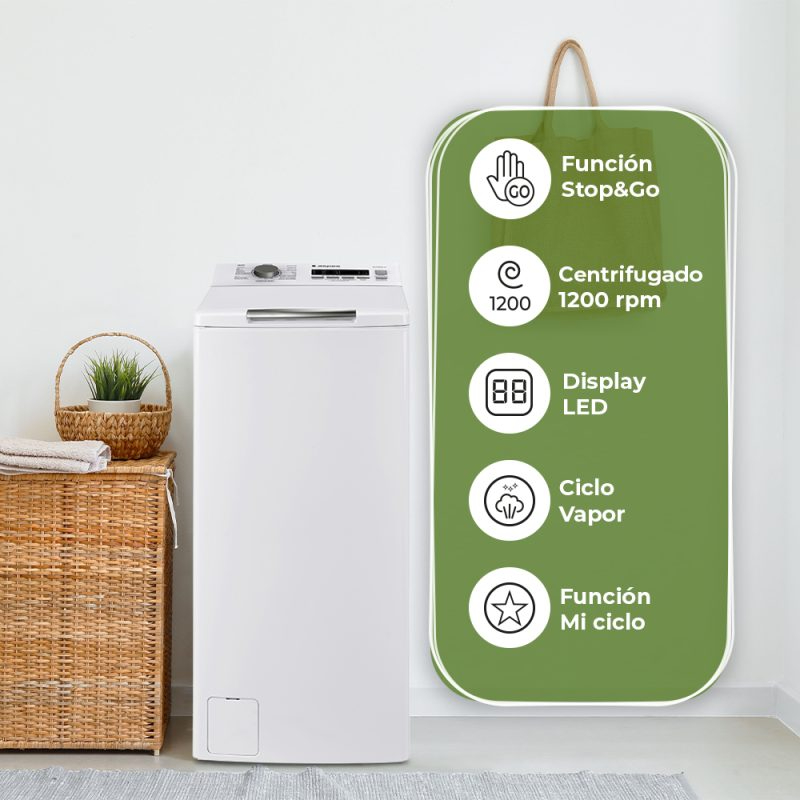 Lavadora con capacidad de carga 6 kg y una velocidad máxima de centrifugado de 1200 rpm. Motor universal con eficiencia energética C y nivel sonoro máximo de 78 dB.