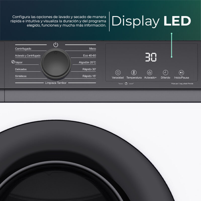 Estética blanca con puerta XXL transparente, tambor de acero inoxidable con superficie diamante. Sistema de control electrónico con Display LED con 11 programas de lavado y funciones para garantizar el mejor resultado y cuidado en tu colada.