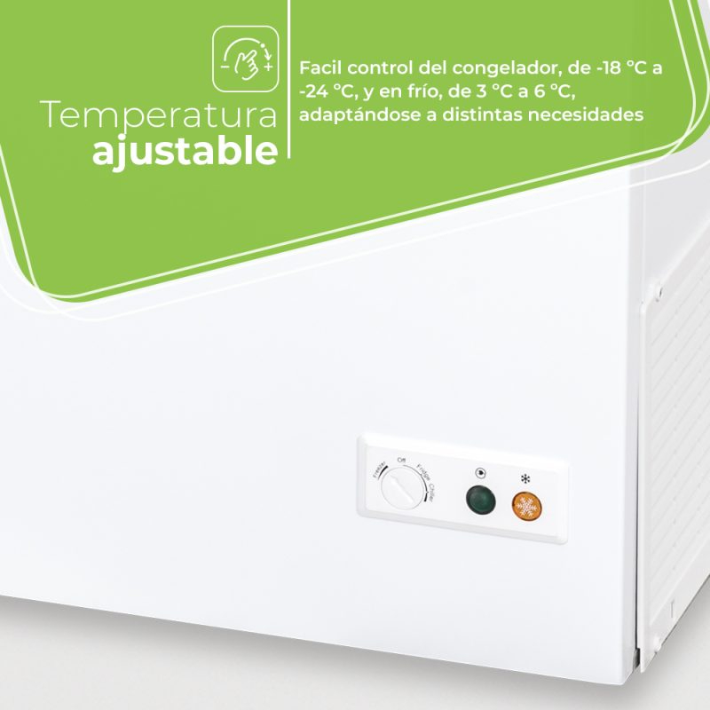 Estética blanca con 1 puerta de abertura con tirador. Iluminación interior LED. Sistema de control electrónico con Display LED, descongelación manual y funciones con las que sacar el mayor rendimiento al congelador.