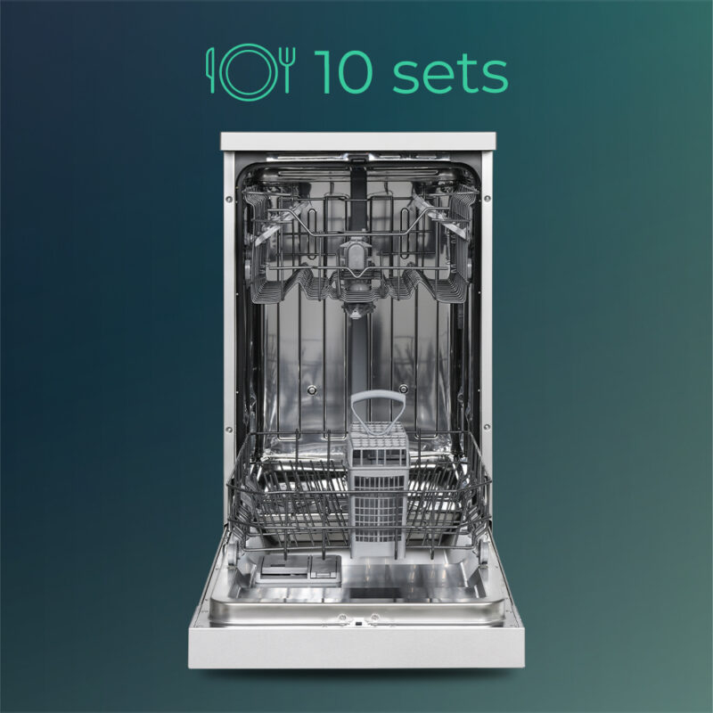 Lavavajillas con capacidad para 10 sets de cubiertos y sistema de secado super active. Motor universal con eficiencia energética E y nivel sonoro máximo de 49 dB.