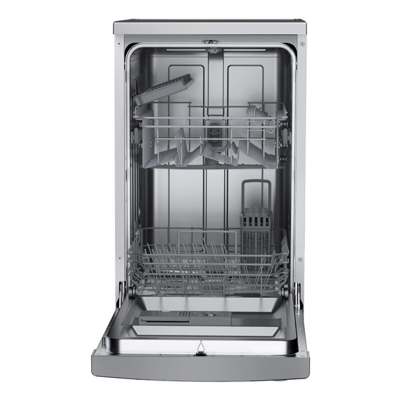 Lavavajillas con capacidad para 9 sets de cubiertos y sistema de secado residual. Motor universal con eficiencia energética E y nivel sonoro máximo de 49 dB.