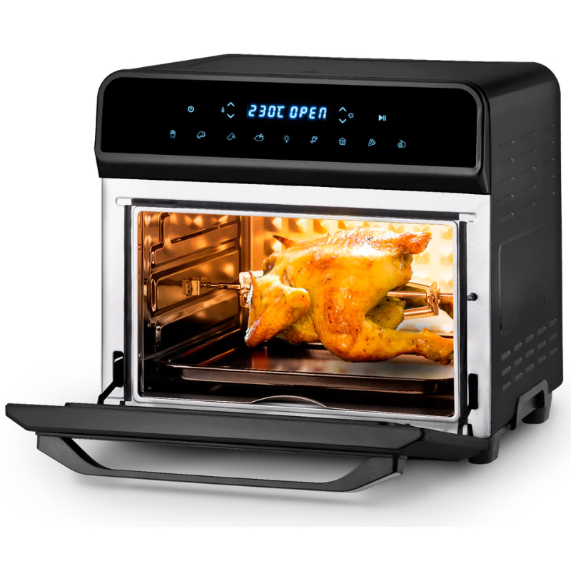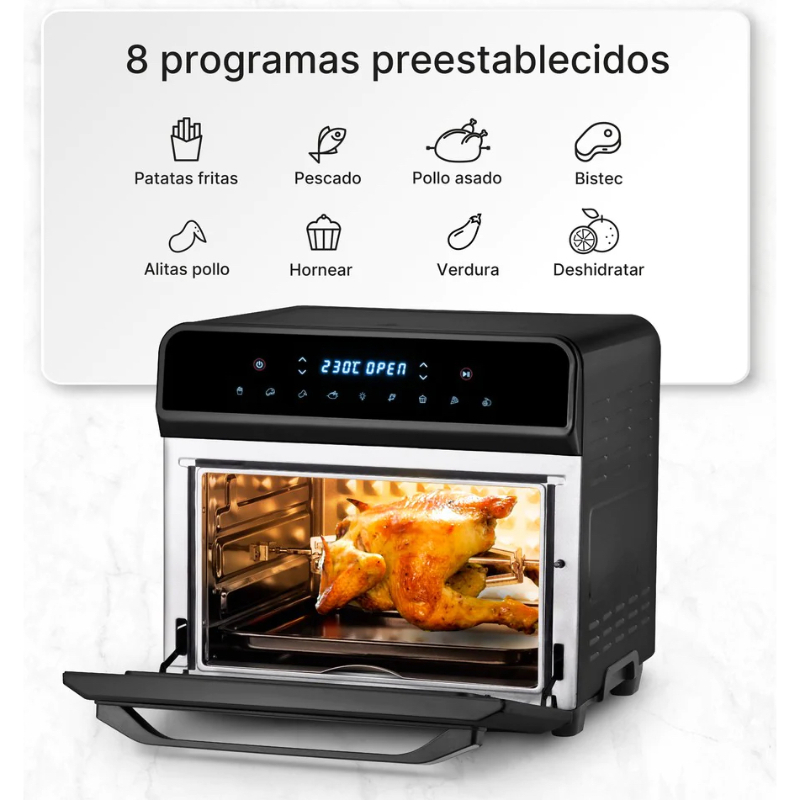 Con una potencia de 1800W y con sus 8 programas preestablecidos, entre ellos deshidratar y rotisserie, podrás disfrutar de una amplia variedad de platos. Además ahorrarás hasta un 60% de energía en comparación con un horno.