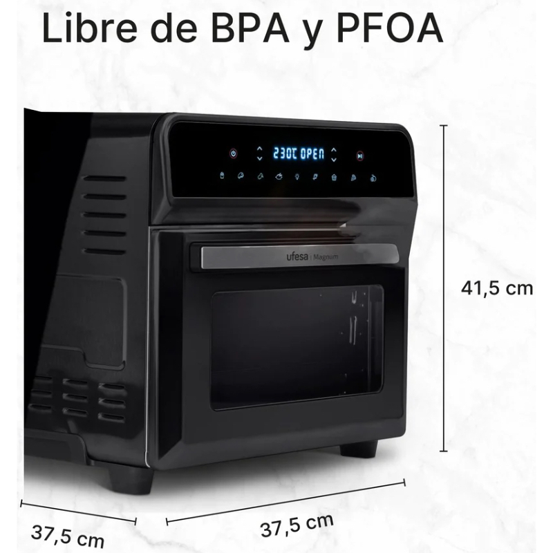 Gracias a su control digital de tiempo y temperatura hasta 230ºC tendrás el control total sobre tus recetas, mientras que el temporizador de hasta 60 minutos te permite ajustar con precisión el tiempo de cocción.