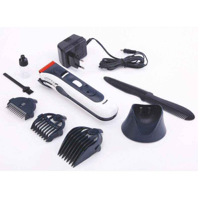 Accesorios de barbero incluidos: peine, aceite lubricante, cepillo para limpieza de cuchillas, adaptador de carga.