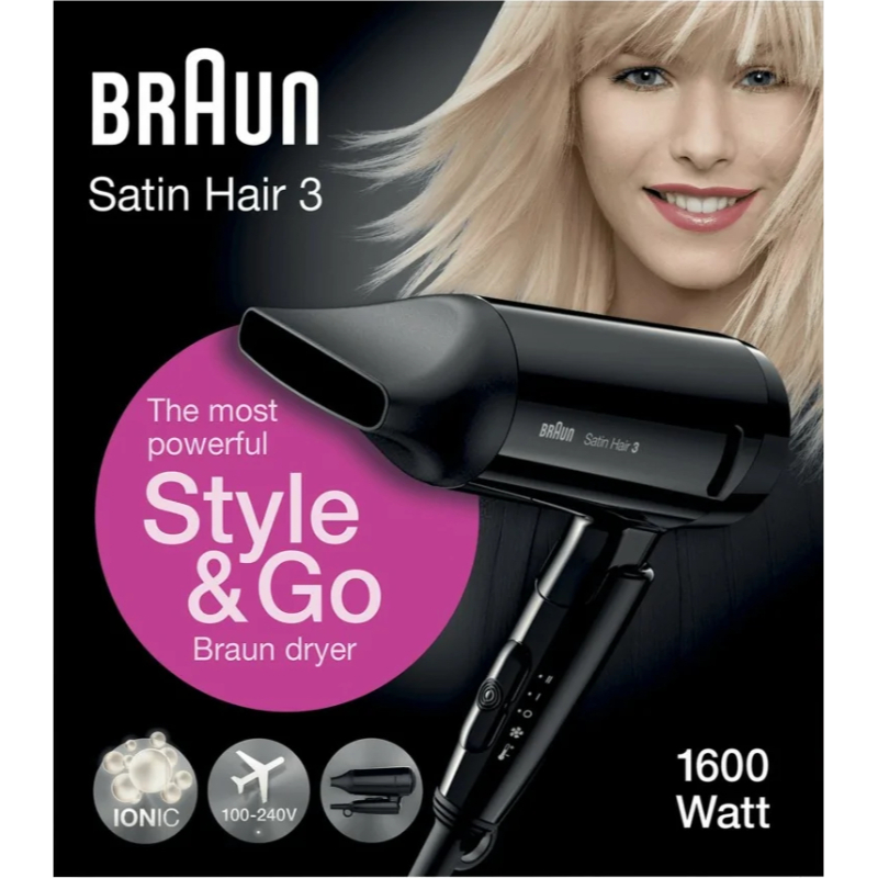 El secador iónico Style&Go HD350 forma parte de Style&Go, la colección de viaje más pequeña y ligera de Braun, perfecta para dar forma a tu peinado en cualquier parte o para lograr resultados geniales sobre la marcha.