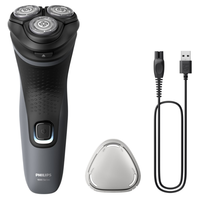 Philips Shaver 1000 Series S1141/00 Afeitadora eléctrica en seco. Sistema de afeitado: Máquina de afeitar de rotación. Color del producto: Negro. Fuente de energía: Batería, Tecnología de batería: Níquel-metal hidruro (NiMH), Tiempo de funcionamiento: 40 min Afeitado rápido y apurado La afeitadora eléctrica serie 1000 de Philips te ofrece un afeitado rápido y apurado por una buena relación calidad-precio. Las 27 cuchillas autoafilables PowerCut y su capacidad de lavado total hacen que la afeitadora sea fácil de usar y siempre fiable.