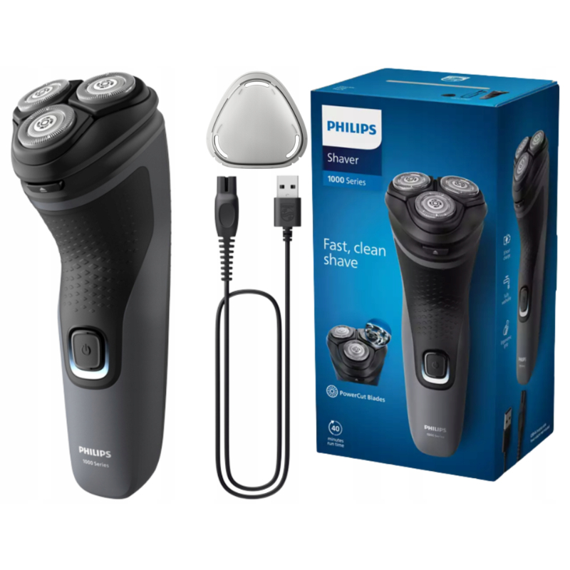 Philips Shaver 1000 Series S1141/00 Afeitadora eléctrica en seco. Sistema de afeitado: Máquina de afeitar de rotación. Color del producto: Negro. Fuente de energía: Batería, Tecnología de batería: Níquel-metal hidruro (NiMH), Tiempo de funcionamiento: 40 min Afeitado rápido y apurado La afeitadora eléctrica serie 1000 de Philips te ofrece un afeitado rápido y apurado por una buena relación calidad-precio. Las 27 cuchillas autoafilables PowerCut y su capacidad de lavado total hacen que la afeitadora sea fácil de usar y siempre fiable.