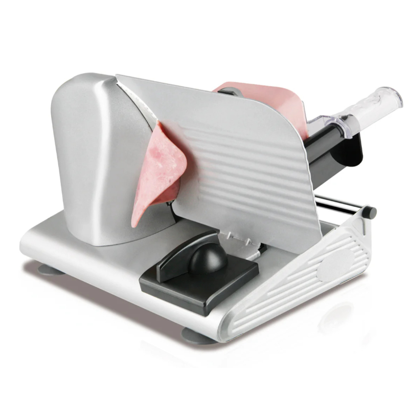 150W Cortafiambres de cuerpo meta´lico de gran potencia Cuchilla de acero inoxidable desmontable de 19cm de dia´metro Mesa de corte con inclinacio´n Grosor de corte regulable 1-15mm
