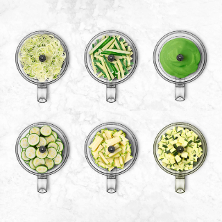 Es un procesador 10 en 1 con el que podrás laminar, rallar hasta en 3 cortes juliana (corte fino, medio y grueso), picar, cortar en batonnet, triturar, mezclar, amasar y emulsionar. Consigue tu corte perfecto en segundos y de manera muy fácil.