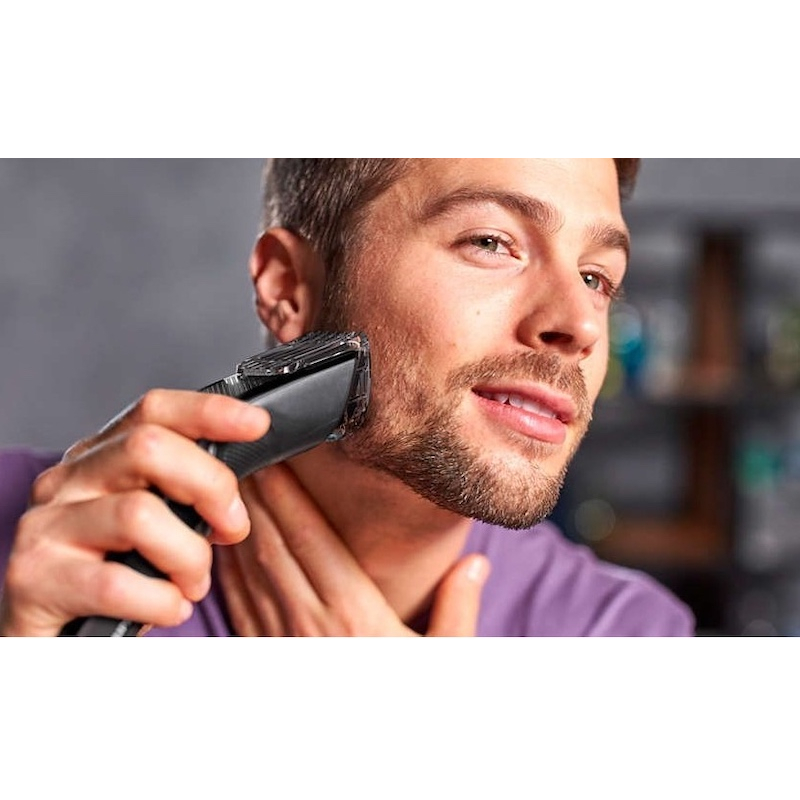 Control de longitud preciso con 13 posiciones de 0,5 a 23 mm. Incluye un peine-guía para barba con 12 longitudes ajustables de 1 a 23 mm.