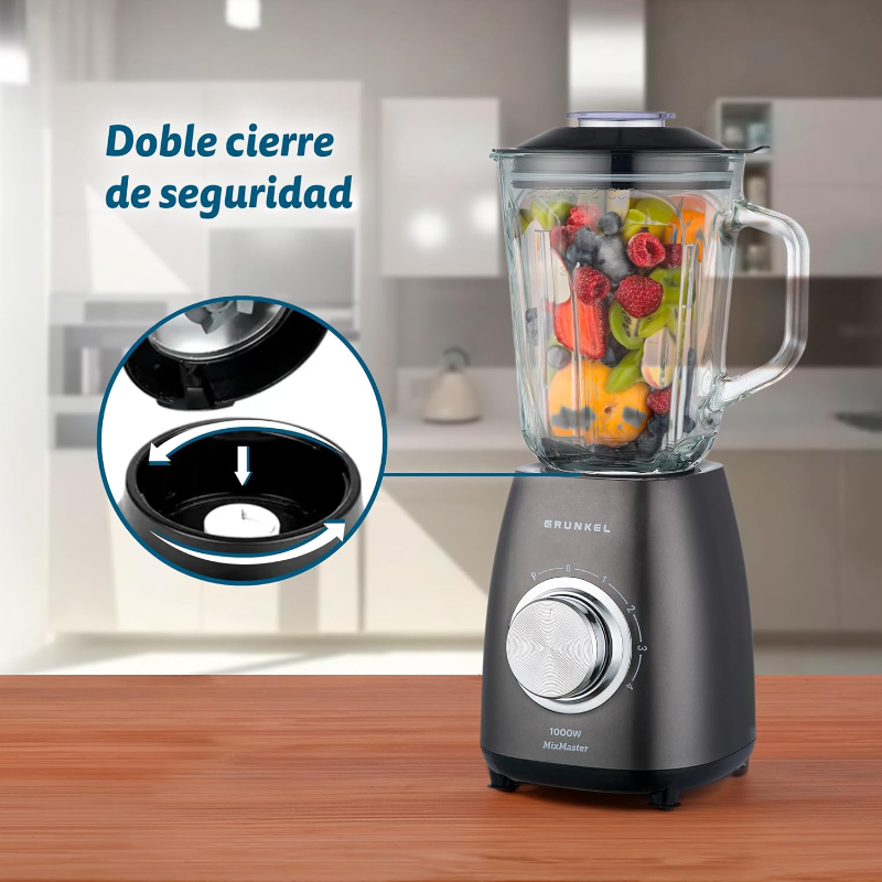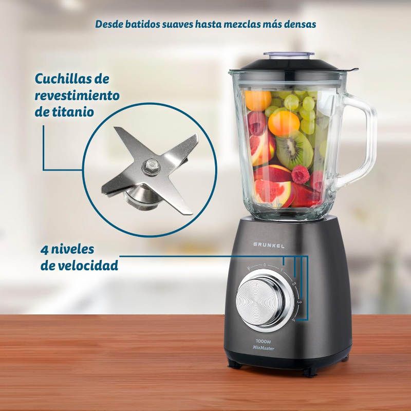 otencia 1000W Capacidad 1,5L Cuchillas con revestimiento de titanio 6 Niveles de velocidad 4 Función Pulse Doble cierre de seguridad Base antideslizante