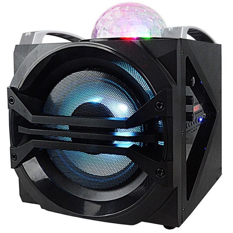 Altavoz Bluetooth de alta gama con el que podrás reproducir desde múltiples soportes (USB, BT, Aux-IN),con una bola de luces LED (con distintos modos de iluminación) que pueden cambiar al ritmo de la música y todo ello con una calidad de sonido inmejorable y función de karaoke. Incluye mando a distancia, cable auxiliar y dos conexciones para micrófono