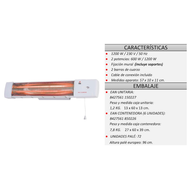 Radiador eléctrico para cuarto de baño: - 1200 W - Fijación mural - 2 barras de cuarzo - Cable conexión incluido - 2 potencias: 600 W / 1200 W - Medidas aparato: 57 x 10 x 11 cm.