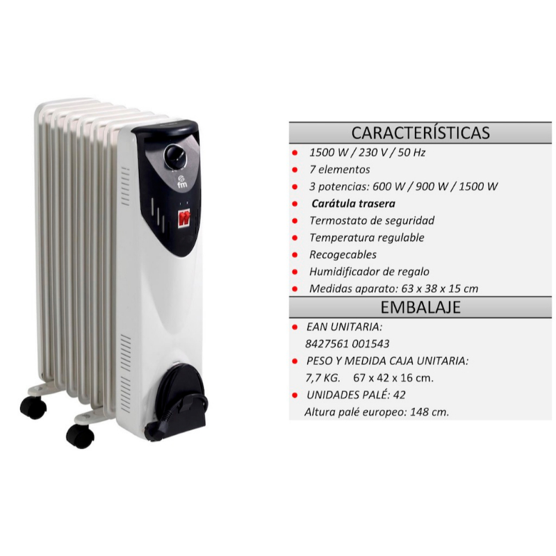 Radiador de aceite. - Indicador Luminoso - Termostato de Seguridad en Sobrecalentamiento - Carátula Trasera - Temperatura Regulable - Ruedas Pivotantes - 1500 W - 7 Elementos - 3 Potencias: 600 W / 900 W / 1500 W
