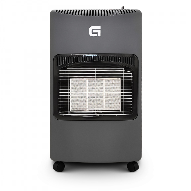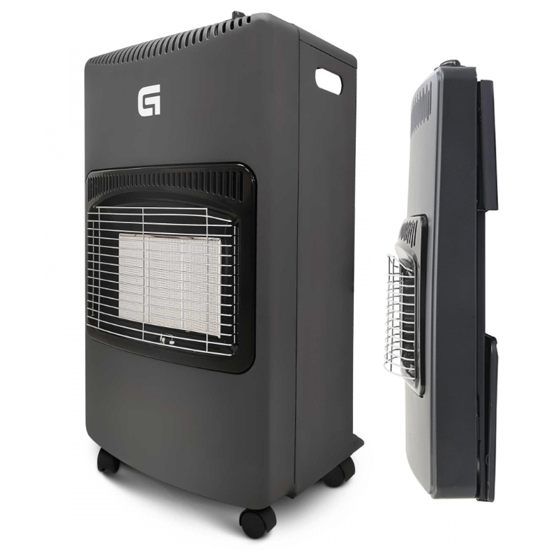 Estufa de gas butano plegable y portátil, cerámica, 4200W. Sistema ignición piezoeléctrico, 3 niveles de calor, cobertura de 20-80m². No incluye regulador y conducto. Apto para bombonas 15kg. Tiene unas dimensiones de 73cm de alto x 42cm de longitud x 41cm de grosor.