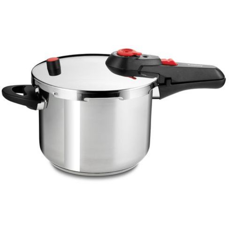 La Olla a presión Red destaca por sus características técnicas avanzadas que la convierten en una herramienta excepcional. Diseñada para proporcionar un método de cocción más saludable y mantener al máximo las vitaminas, esta olla cuenta con un regulador que permite ajustar los niveles de presión operativa en un rango de 60kPa a 110kPa, proporcionando flexibilidad en la preparación de diversos alimentos. Su mecanismo de cierre hermético y control de presión permite cocinar alimentos en un tiempo considerablemente menor, conservando al máximo sus nutrientes y potenciando los sabores. La olla a presión destaca por su capacidad para ablandar legumbres de manera rápida, facilitando la preparación de potajes saludables y reconfortantes. Con ella, podrás disfrutar de recetas clásicas como la fabada asturiana, el cocido madrileño, la exquisita receta de rabo de toro, así como guisos de garbanzos y de cordero. Ventajas de la olla a presión Red: Capacidad de 6 litros: Ideal para preparar porciones generosas de alimentos. Regulador con Niveles de Presión: Ofrece flexibilidad con niveles que van desde 60kPa hasta 110kPa para adaptarse a distintos tipos de alimentos. Válvula de Seguridad: Garantiza un funcionamiento seguro y eficiente, verificando automáticamente la presión interna. Fabricación en Acero Inoxidable 18/10: Tanto la tapa como el cuerpo son resistentes al desgaste, proporcionando durabilidad a largo plazo. Mango de Baquelita con Diseño de Tijera: Facilita la apertura y el cierre prácticos, previniendo quemaduras accidentales durante el manejo. Representación Visual del Nivel de Presión: Líneas blancas indican claramente presión baja o alta para un monitoreo intuitivo del proceso de cocción. Versatilidad en Cocinas: Compatible con todo tipo de cocinas, incluyendo las de inducción, gracias a su fondo que alcanza rápidamente la temperatura óptima.