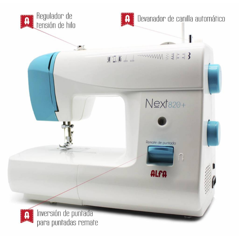 9 puntadas para todo tipo de labores: Ojal automático en 4 pasos, Básicas, Decorativas, Festones, Zig-Zag