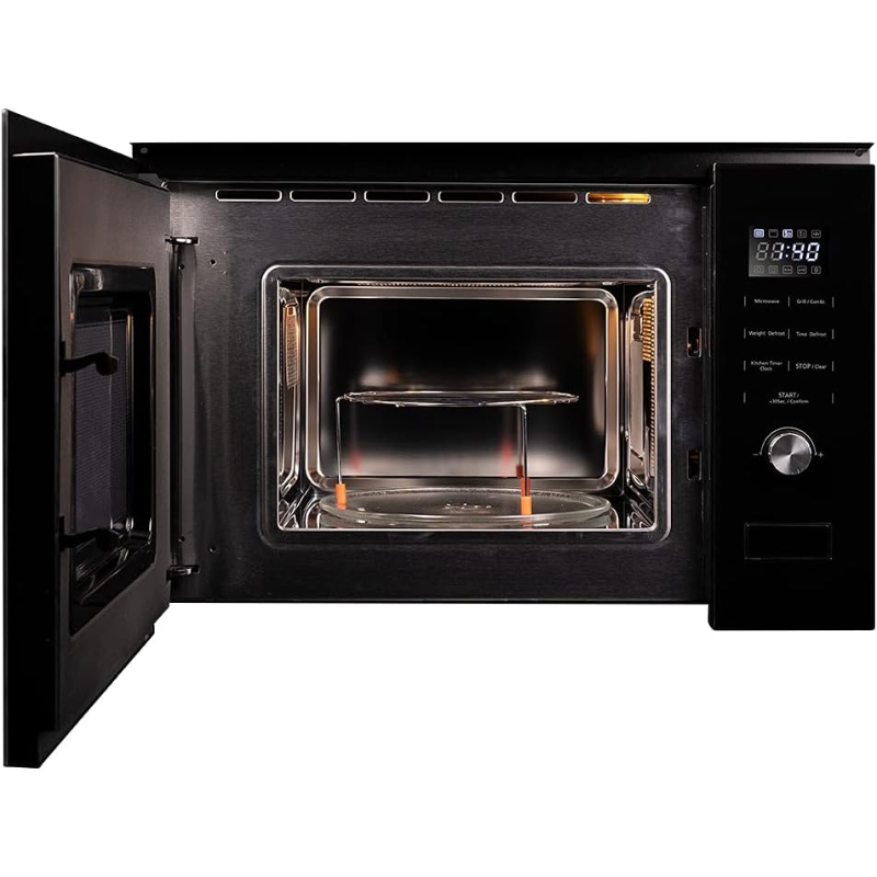 Estética de cristal negro con puerta de cristal negro y abertura con botón. Cavidad de acero inoxidable con iluminación LED y plato giratorio de cristal. Sistema de control eléctronico con Display LED y temporizador digital. Ofrece 5 niveles de potencia, Grill, 2 opciones de cocina combinada y distintas funciones para obtener el mayor rendimiento y facilitar el proceso de cocción.