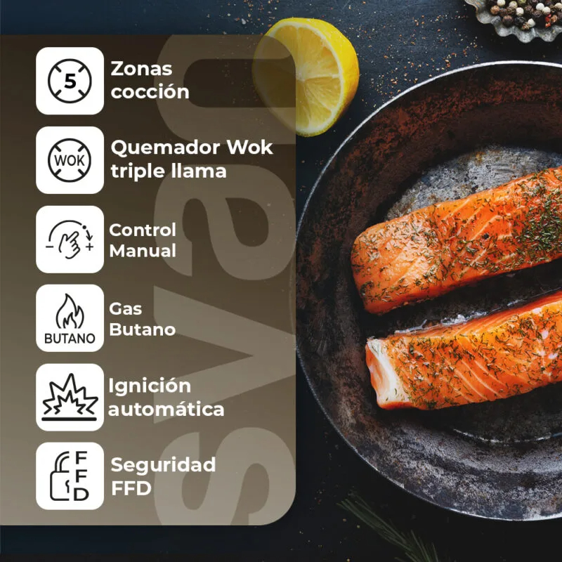 Placa preparada para gas butano con potencia total de W. Cuenta con 5 quemadores de distinto tamaño, uno de ellos es quemador WOK de triple llama.
