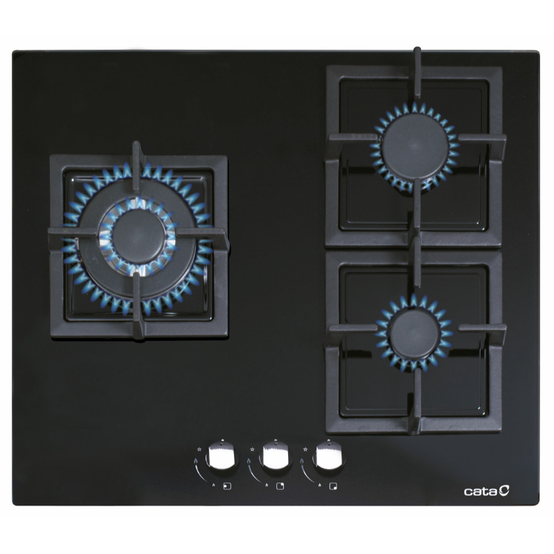 Encimera Multigas preparada para Gas Natural (G20) con accesorios para fácil acoplamiento a Gas Butano (G30). El sistema de anclaje son pletinas de fijación. Cuenta con encendido eléctrico integrado en mando. Posee 3 quemadores de gas, el izquierdo es una triple corons de 3kW, el superior derecho es semi-rápido de 1,75 kW y, por último, el inferior derecho es auxiliar de 1kW.