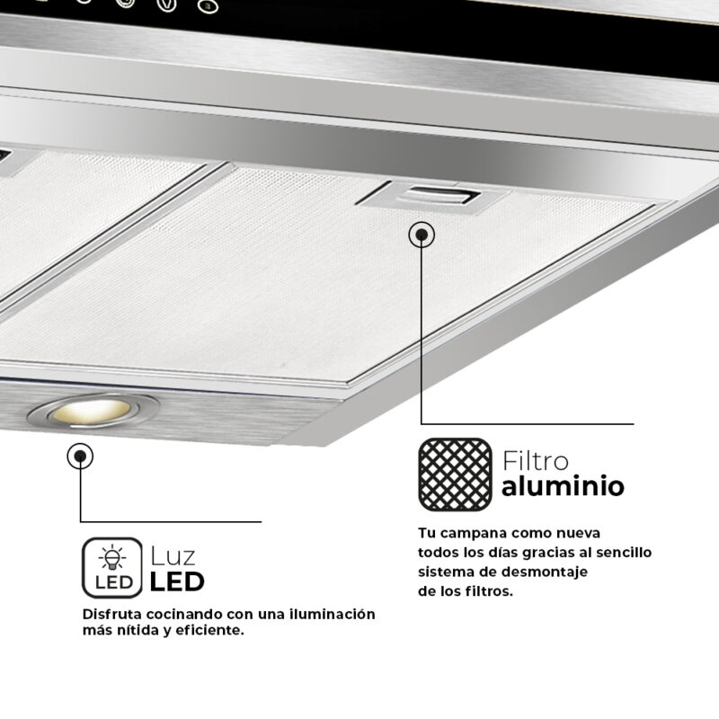 Incluye filtros de aluminio lavables incluso en el lavavajillas. Modelo compatible con filtros de carbón, no incluídos.