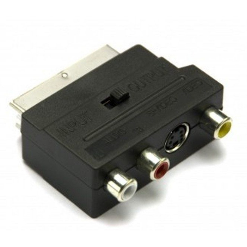 Adaptador de audio / video Scart / RCA + SVHS con selector Scart 21 pin macho 1 x RCA Video hembra 2 x RCA Audio estereo hembra 1 x 4 Pin S-VHS hembra Interruptor para selección Entrada / Salida