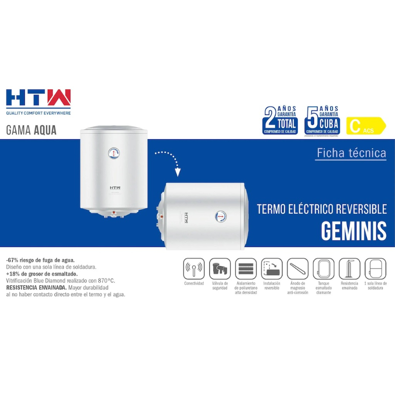 Los termos reversibles GEMINIS tienen tanque esmaltado con termometro, protección anti-hielo y válvula de seguridad para la protección de una posible sobrepresión de agua. Incluyen manguitos electrolíticos para hacer la función de aislante para que no se cree un par galvánico entre los diferentes materiales que componen la instalación, evitando así la corrosión y mejorando la durabilidad del termo. La ventaja de este termo es su capacidad de adaptación ya que puede ser instalado tanto vertical como horizontalmente. En cuanto a diseño está preparado para adaptarse en cualquier lugar gracias a su diseño y su acabado en mate que garantizan un aspecto fino y elegante.