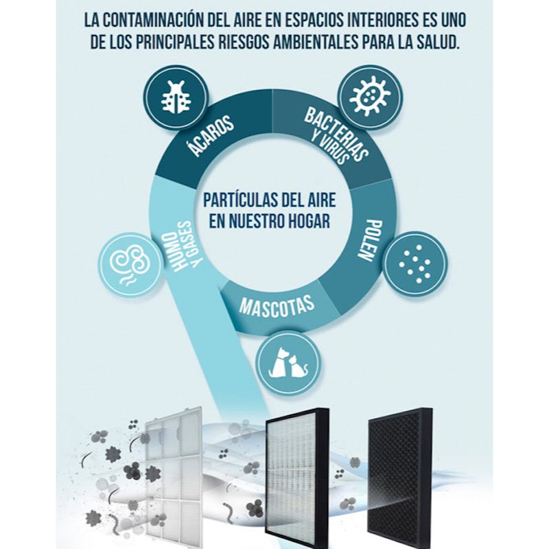 IONIZADOR: neutraliza las partículas de polvo, polen, humos de coche y humos de diversos tipos cuyas partículas se quedan en el aire.