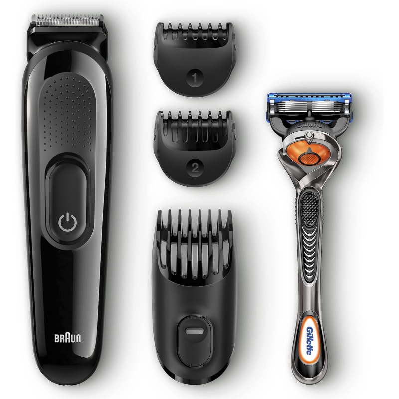 El Kit 4 en 1 de Braun SK3000 para recortar el pelo y la barba con auto-afilador cuchillas es la opción ideal para afeitarte en casa. Viene con una maquinilla de afeitar Gillette Fusion 5 Proglide y 3 accesorios de peine para 8 longitudes de corte diferentes (0,5-21mm). De fácil limpieza tiene una duración de la batería de 40 minutos de funcionamiento y necesita unas 10 horas de carga para obtener una carga completa.