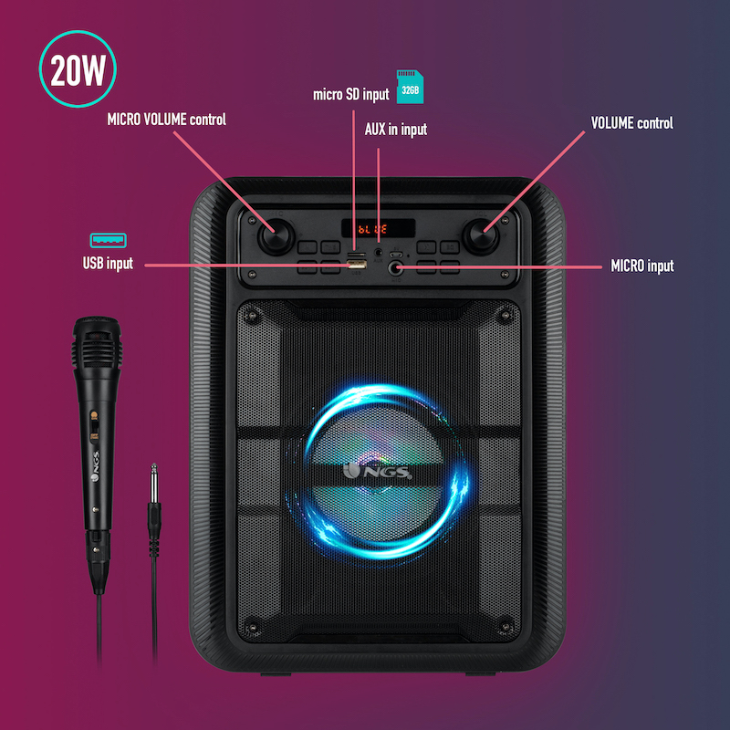 Incluye un micrófono vocal ideal para karaoke y está equipado con 6,3 mm de cable jack que ofrece una calidad de sonido profesional.