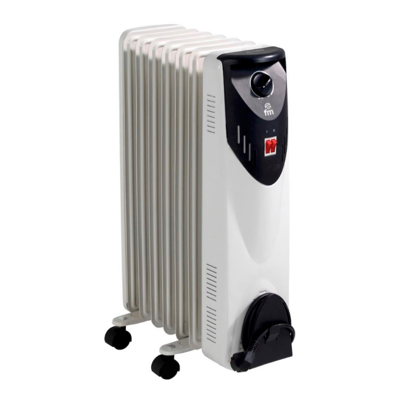 Radiador de aceite. - Indicador Luminoso - Termostato de Seguridad en Sobrecalentamiento - Carátula Trasera - Temperatura Regulable - Ruedas Pivotantes - 1500 W - 7 Elementos - 3 Potencias: 600 W / 900 W / 1500 W