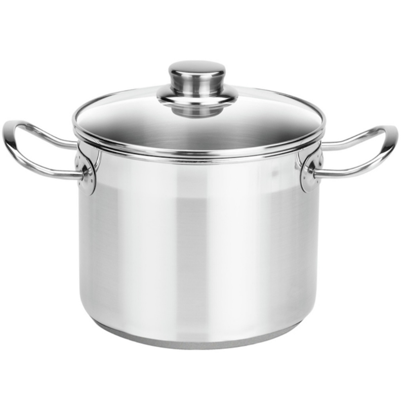 Olla con tapa de cristal de 18 cm de base y 20 cm de boca. Capacidad: 3.5l.