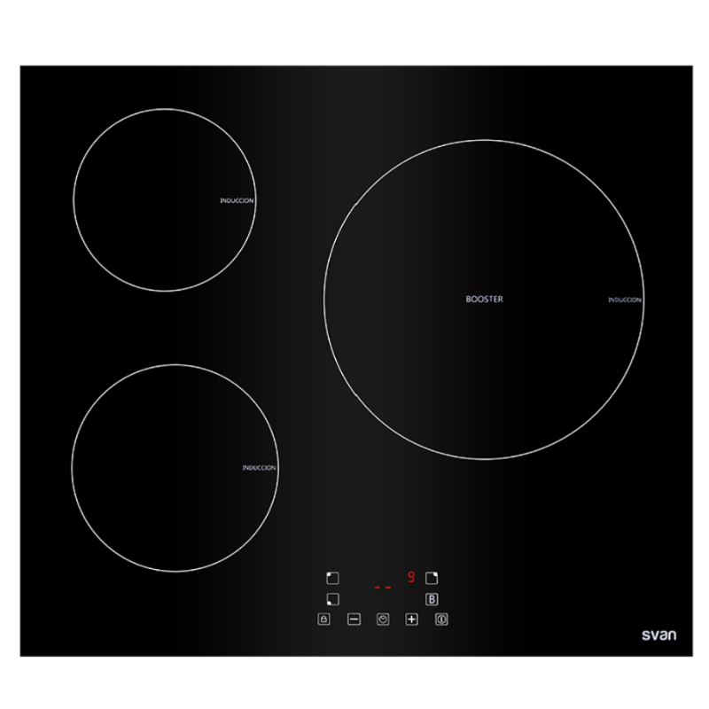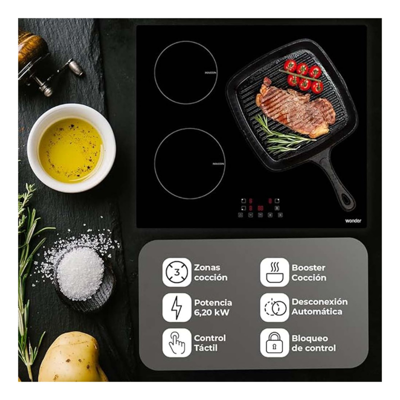 Placa de cocción con tres zonas independientes y una potencia combinada de 6200 W, ofrece un diseño en cristal negro con control táctil. Cuenta con nueve niveles de potencia y funciones avanzadas para maximizar el rendimiento y la seguridad durante la cocción.